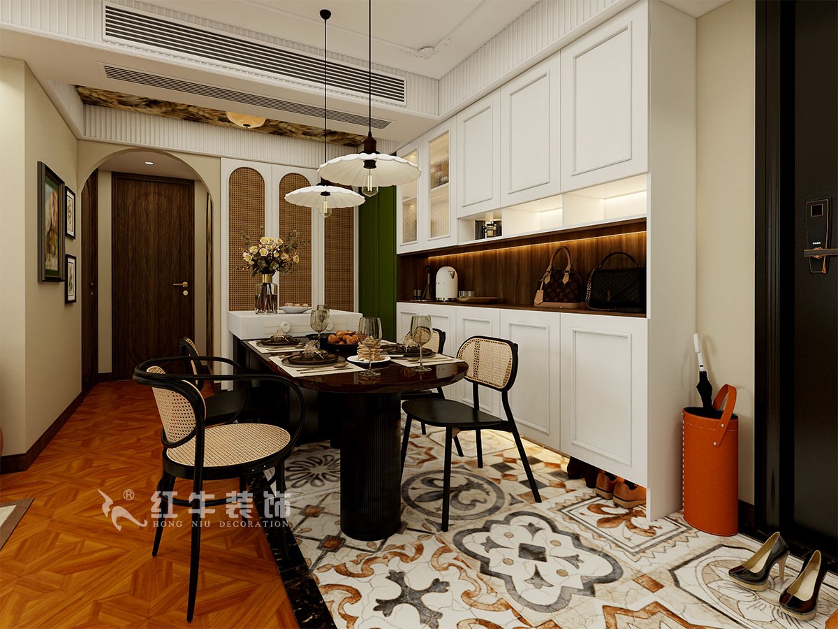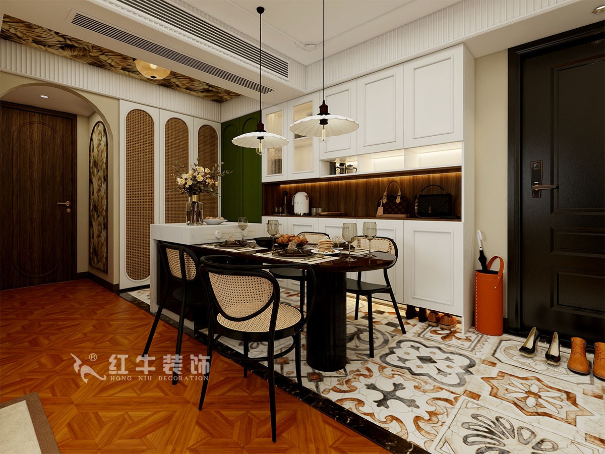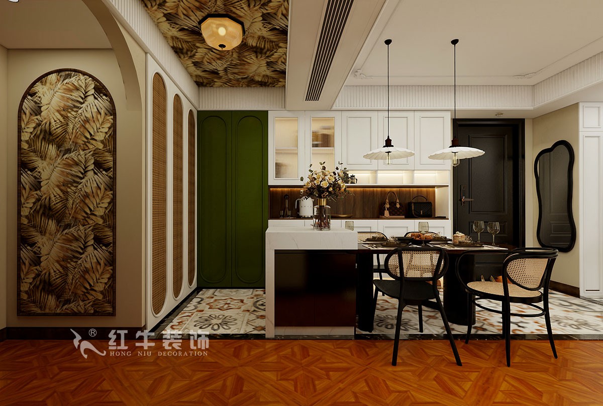 此案主要是三口居家居住,整體以法式南洋復(fù)古風(fēng)格為主,胡桃木的地板+藤編餐椅,復(fù)古風(fēng)滿滿。兩側(cè)墨綠色和白色餐邊柜,有藏有露,收納能力Max,關(guān)鍵是顏值還高。拼木地板,法式氛圍感的標(biāo)配。