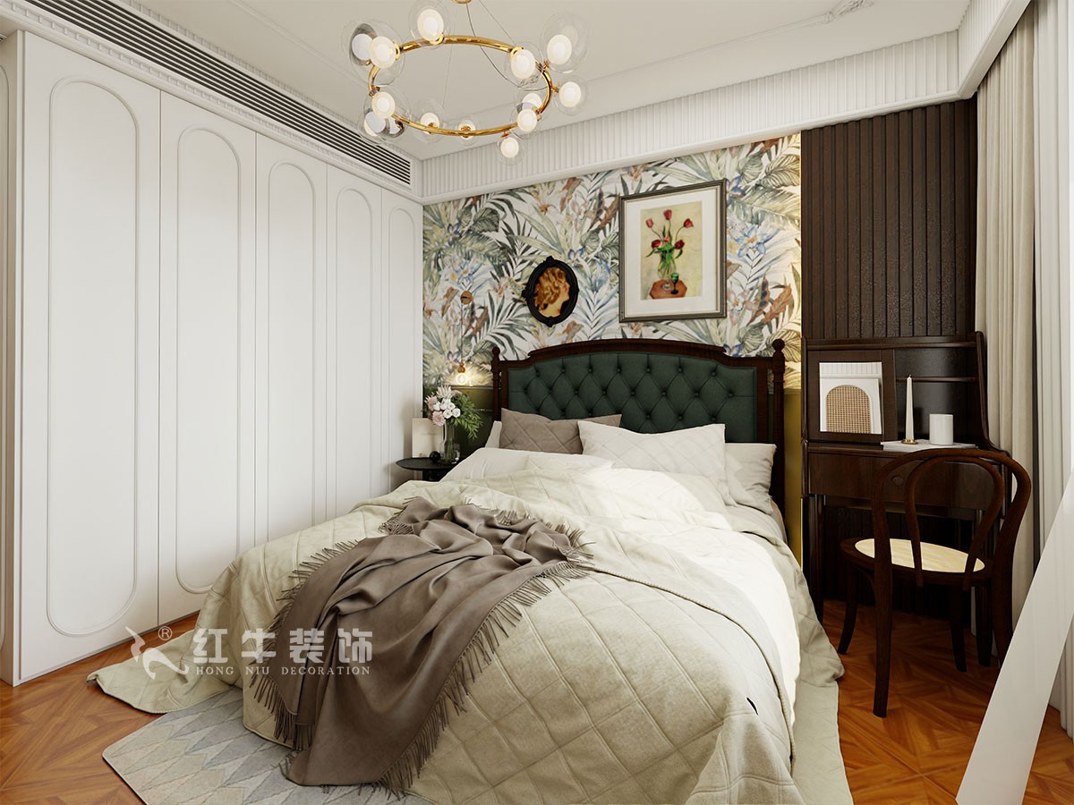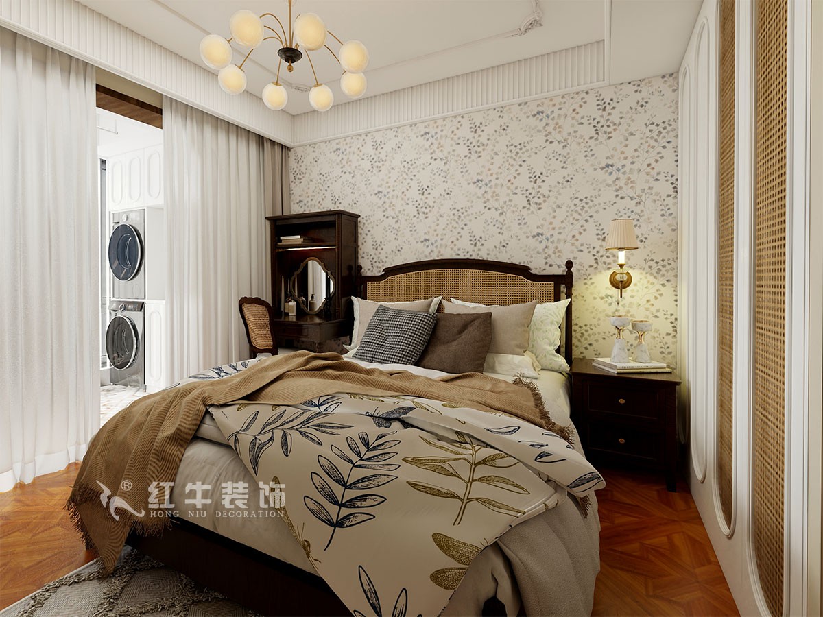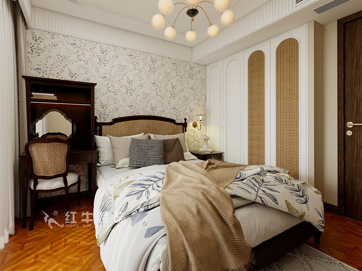 復(fù)古文藝的黃銅吊燈搭配古樸自然的壁燈,高雅素凈,給臥室?guī)砹烁釉娨獾姆諊鎏砹松畹那槿?。古樸精致的床頭柜加上了藤編的元素,心情都變得平穩(wěn)寧靜。