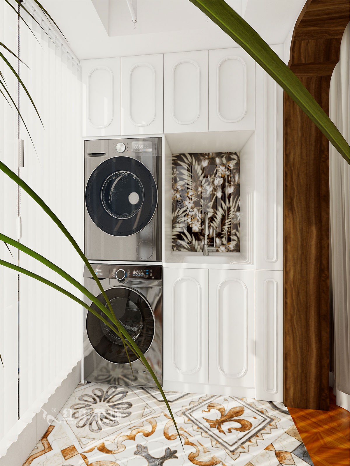 整體法式南洋復(fù)古風(fēng)格的設(shè)計(jì),搭配上顯眼的綠色植物,讓整個空間呈現(xiàn)出一種生機(jī)勃勃的自然美。