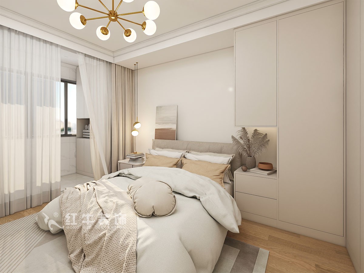 通過改造,把原有的主臥與陽臺的隔墻拆除,把陽臺的采光和戶外的風景全部引入主臥。原始的陽臺留出洗衣房保存的功能性,使得整個主臥視覺的縱深感更加強烈。