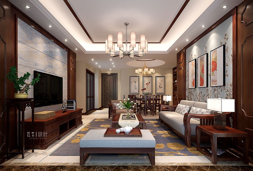 本案新中式風(fēng)格,繼承明清時(shí)期家居理念的精華,將其中的經(jīng)典元素提煉并加以豐富,同時(shí)改變?cè)锌臻g布局中等級(jí)、尊卑等封建思想,給傳統(tǒng)家居文化注入了新的氣息
