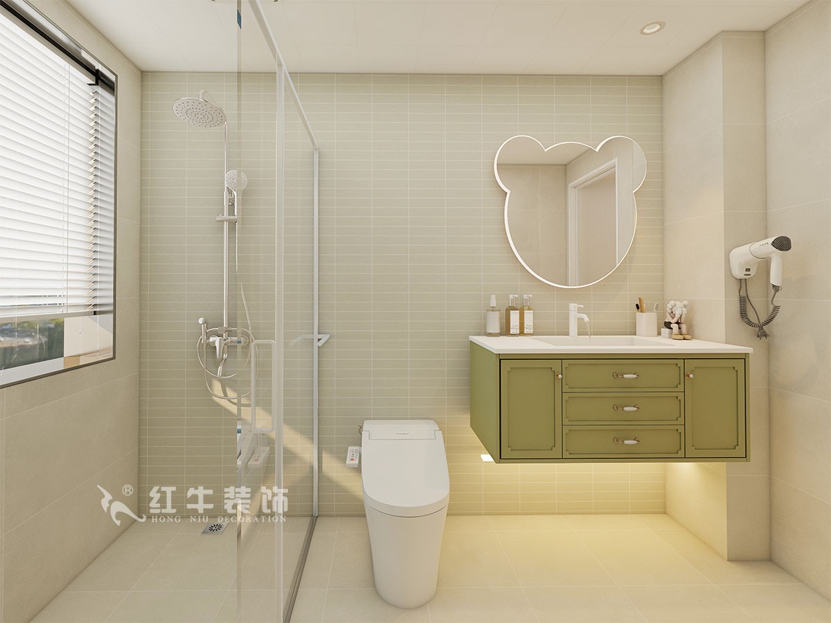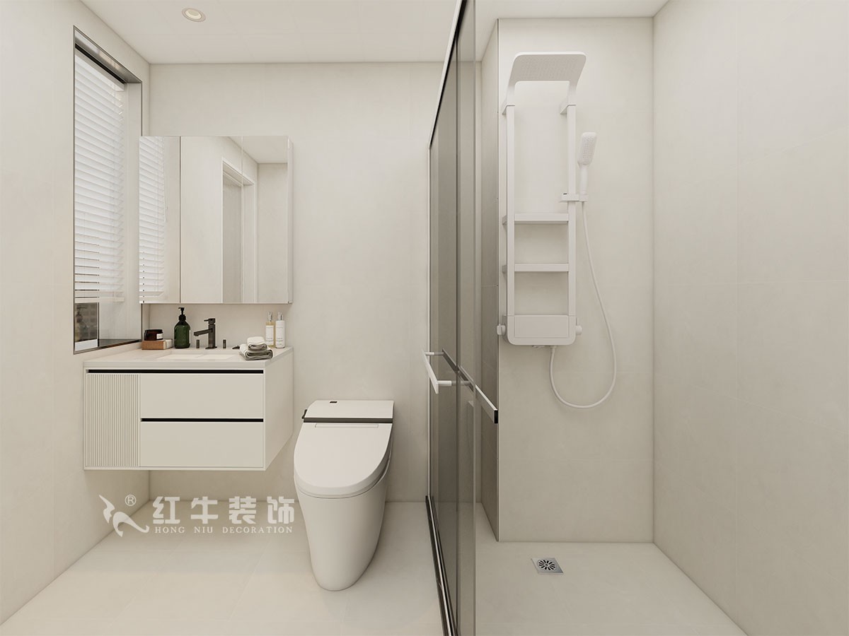 衛(wèi)生間說明:選擇整體色彩搭配干凈、大方,選擇大尺寸淺灰色瓷磚上墻,氛圍感溫馨感滿滿。