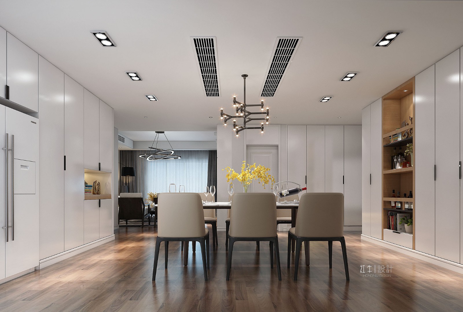 此房型規(guī)整,南北通透,最大的問(wèn)題就是如何利用餐廳的那個(gè)區(qū)域,大部分業(yè)主都會(huì)把他做成房間或者書(shū)房,當(dāng)然這個(gè)客戶我們做過(guò)很多的方案,不斷的溝通,最后把原來(lái)敞開(kāi)的地方全部做成了餐廳,一個(gè)大的長(zhǎng)條桌,增大了整個(gè)餐廳的既視感,大氣而簡(jiǎn)單,體現(xiàn)了港式得商務(wù)風(fēng)??蛻魧?duì)收納空間的要求比較高,包括客廳的背景墻也采用了一些柜子的組合來(lái)完成整面墻的設(shè)計(jì),能動(dòng)的墻體幾乎都有改動(dòng),大大的增加了每個(gè)空間的利用率。