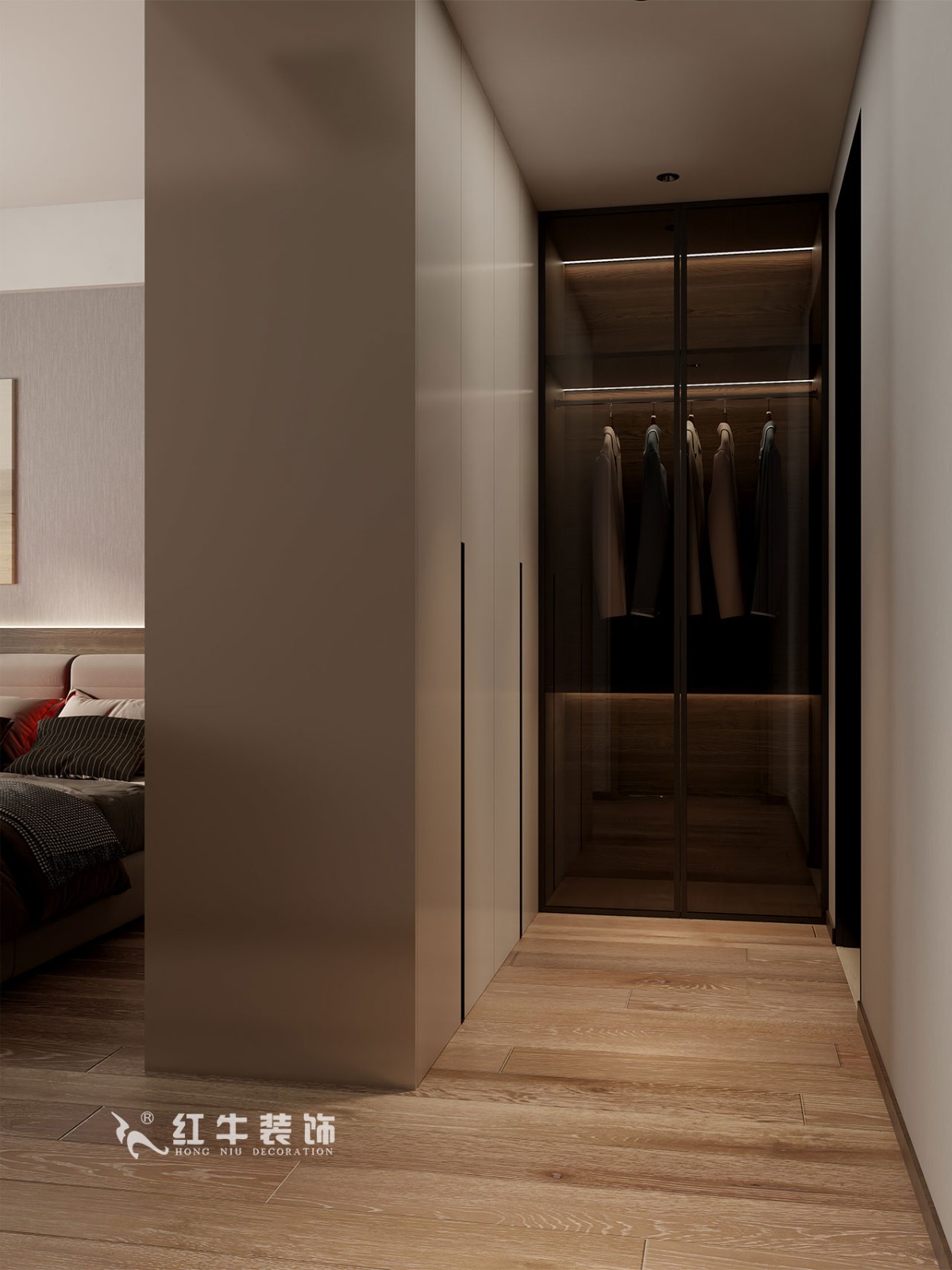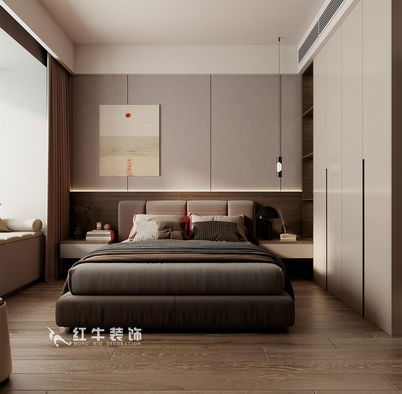主臥無主燈設(shè)計(jì),搭配床頭燈帶與吊燈,多光源滿足不同需求。延續(xù)整體空間的色調(diào),低飽和度色系搭配木地板,營造溫馨舒適、優(yōu)雅的睡眠空間。