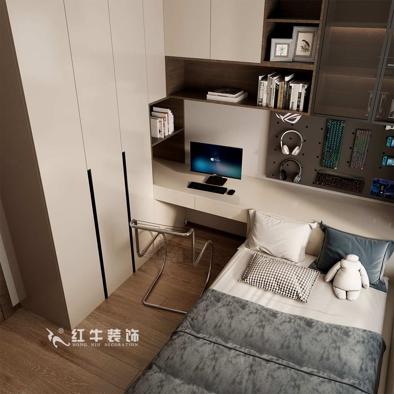 多功能房間,床頭延伸可作書桌、置物臺等,白色定制柜,開放格、洞洞板滿足業(yè)主日常收納、儲物等需求。