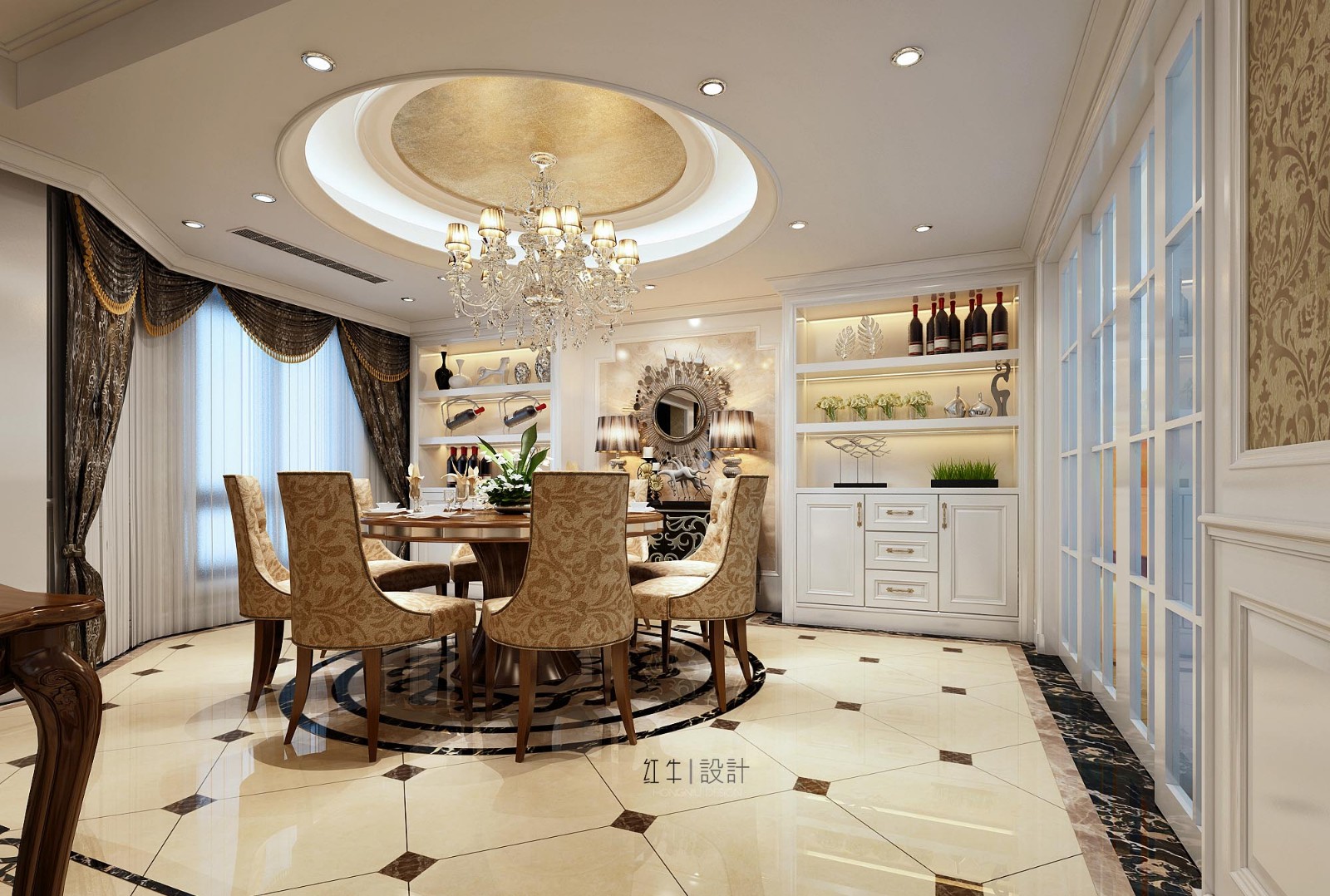 簡約歐式風格沿襲古典歐式主精華,融入現(xiàn)代生活元素,歐式風格有的不只是豪華大氣,更多的是愜意和浪漫。通過完美的點線,精益求精的細節(jié)處理,帶給家人不盡的舒適觸感.本案中,設計師大膽使用了深色系的軟裝搭配,點綴以棕色的硬裝家具的呼應,再融合華麗的線條以及地面拼花,正迎合了歐式風格強調以華麗的裝飾,濃烈的色彩,精美的造型打到雍容華貴的效果。餐廳的金箔頂面和電視背景墻的暖色大花墻紙,更從新古典的尊貴感上為空間增色不少。