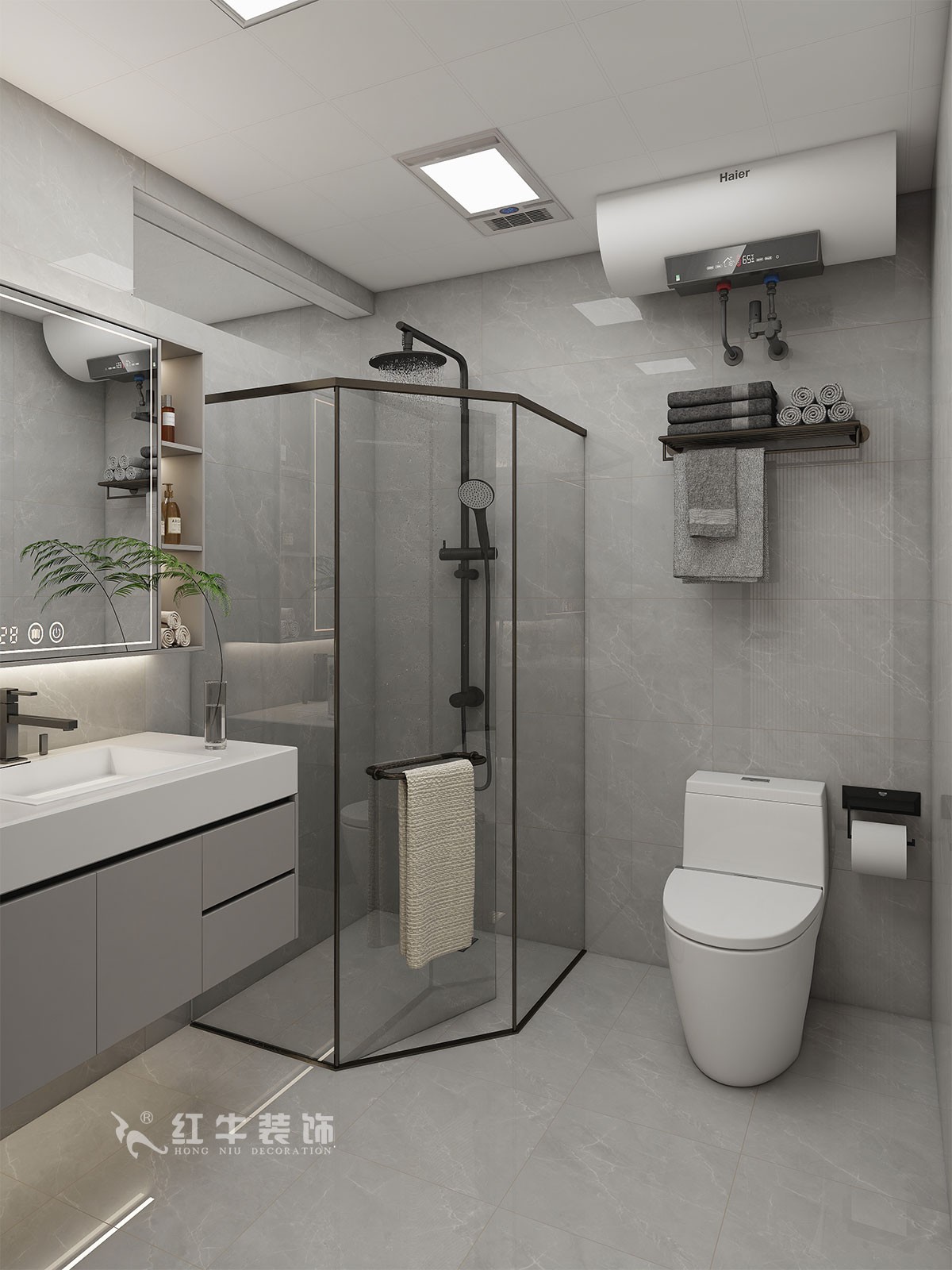 新房養(yǎng)老裝修,要求簡約大氣,客衛(wèi)由于有兩個主水管和一個換氣管道,占用面積太大,就把書房墻體打掉,借了面積,設計成臺盆,功能更合理。然后由于兩個人居住,把進戶門左側的房間縮小,增加了鞋柜和衣帽柜的面積,進家里感覺更寬敞明亮。