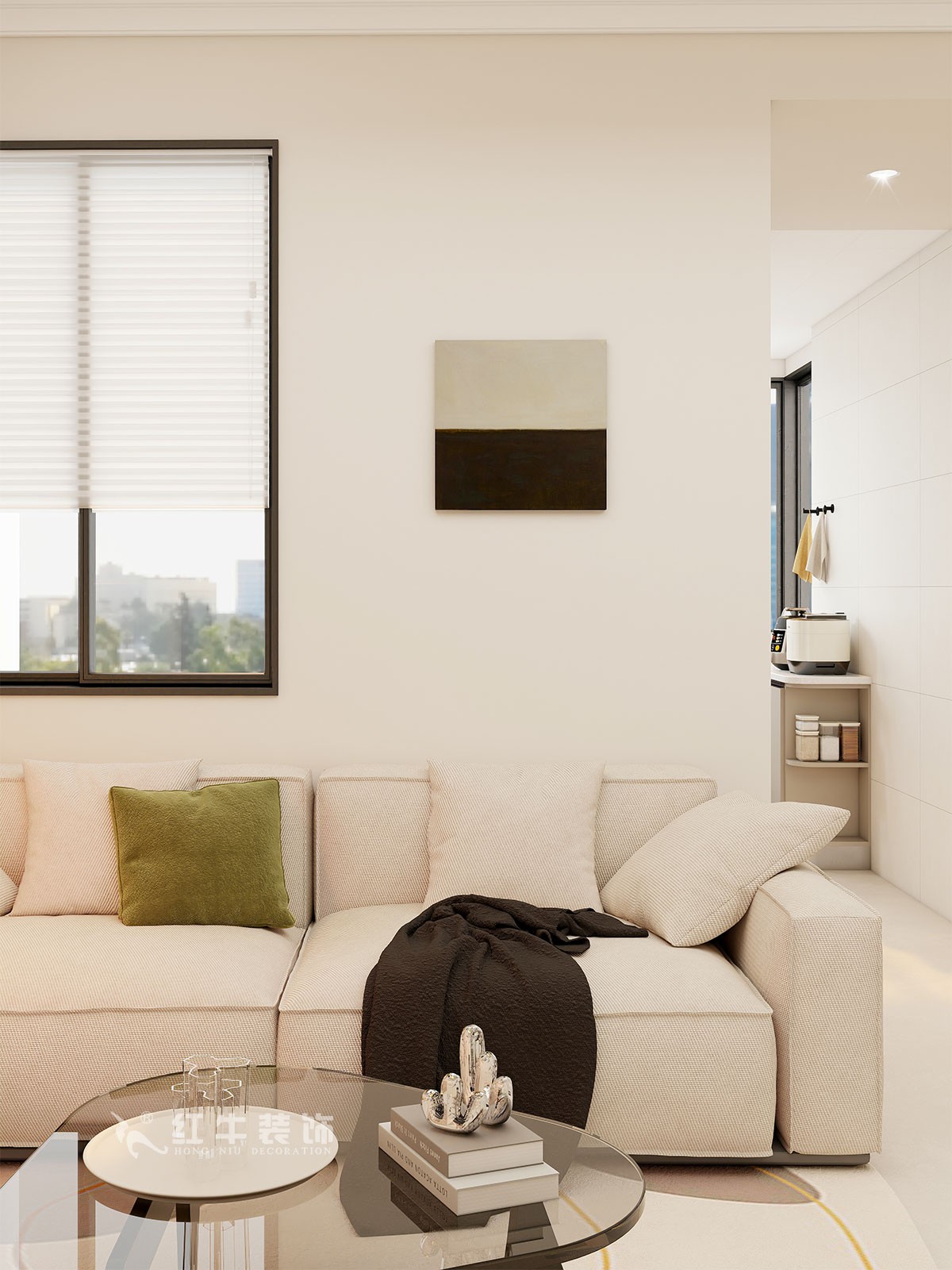 客廳說(shuō)明:客廳空間墻面大面積留白,柔和的色彩,也為空間注入了時(shí)尚與溫度。
