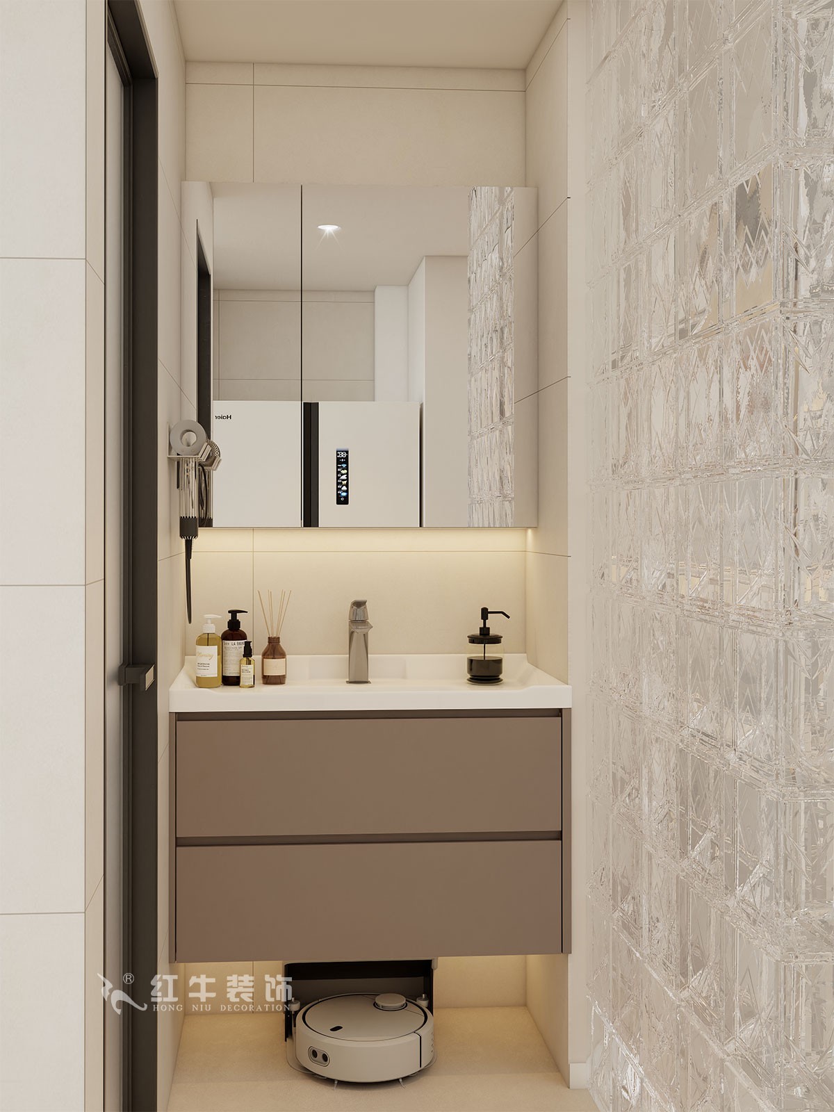 衛(wèi)生間說(shuō)明:干區(qū)選擇整體色彩搭配干凈、大方,選擇大尺寸瓷磚上墻,高級(jí)感滿滿。