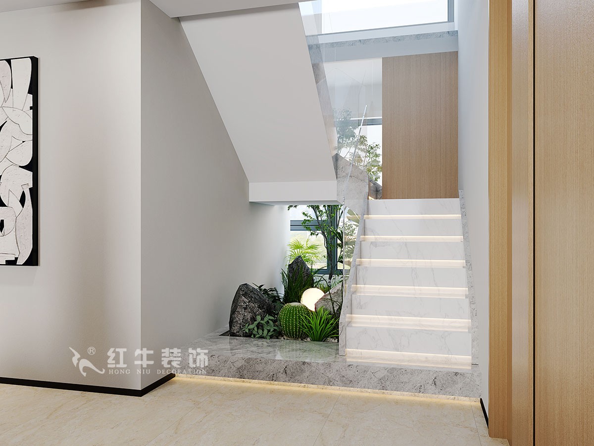 本方案樓梯區(qū)域改造,拆除一樓原有隔斷墻體,將與客廳打通銜接。拓寬視覺動線,讓整體格局更顯通透敞亮;同時以簡約線條與原木質(zhì)感呼應(yīng)現(xiàn)代原木風基調(diào),營造出寬敞舒適、渾然一體的生活氛圍。