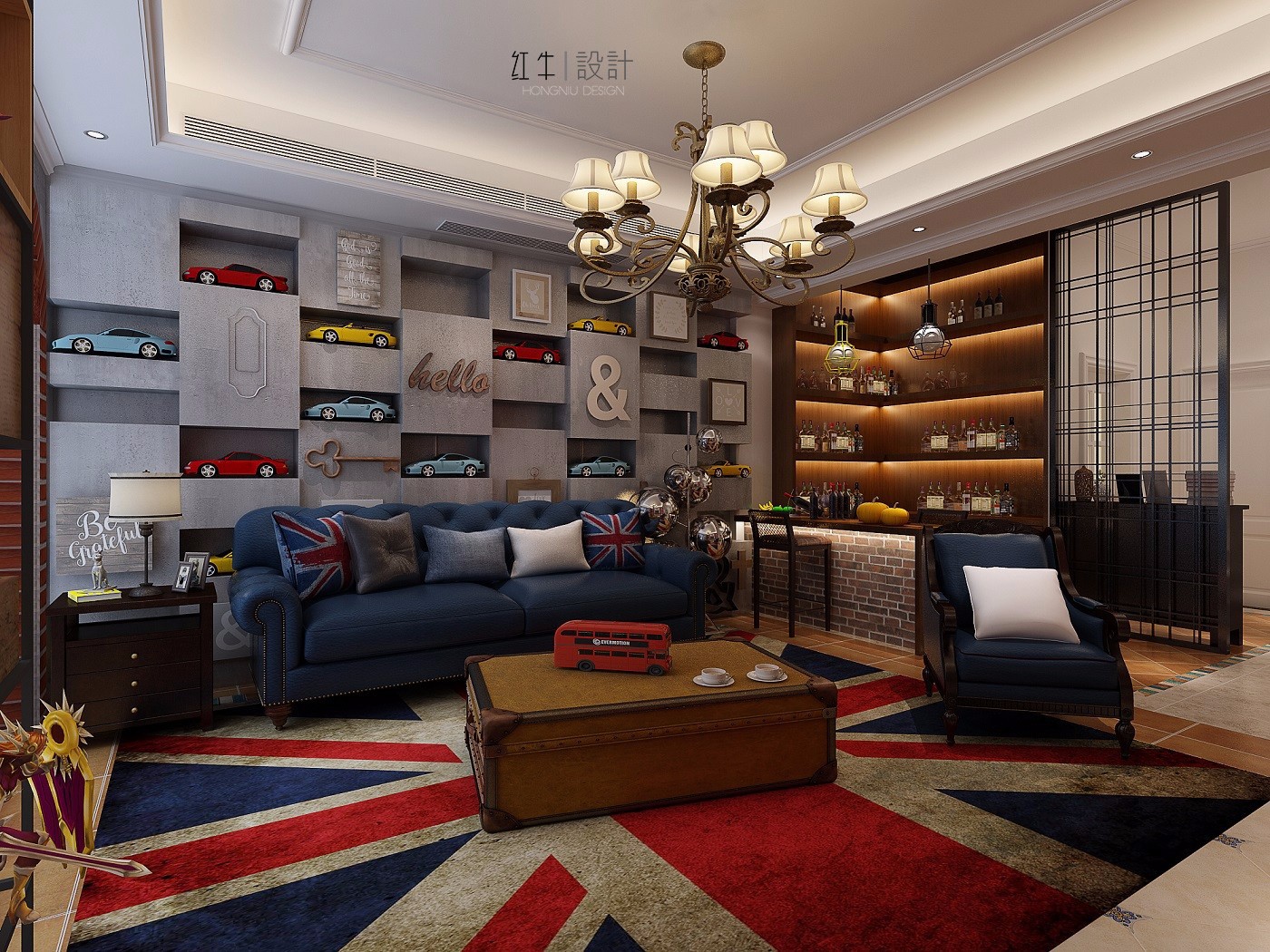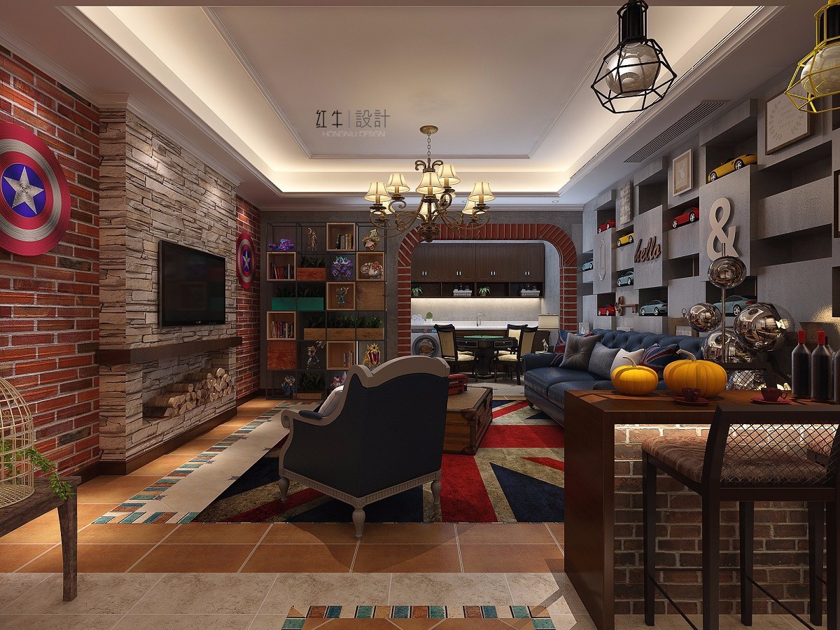 墻上的美隊盾牌,沙發(fā)背景墻上汽車模型,架子上的手辦都是年輕人的興趣所在;手提箱形狀的茶幾以及電視下面的柴火,都極具個性;英國國旗圖樣的地毯與沙發(fā)上同圖案的抱枕相呼應(yīng),充滿時尚感。這一切無不顯示出這是年輕人的休閑場所。