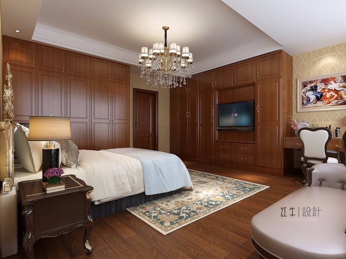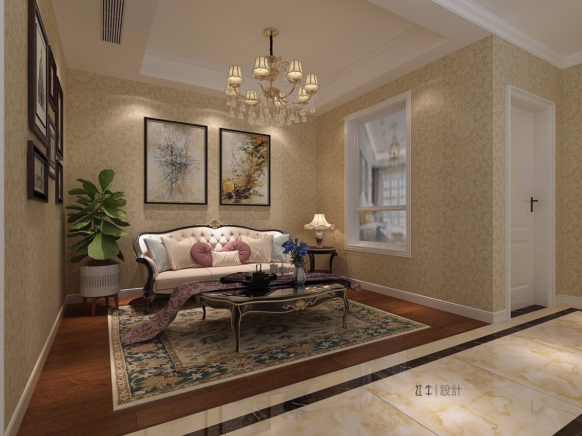 二樓的小客廳延續(xù)了一樓客廳的典雅風(fēng)格,小小的空間通過地毯、裝飾畫、吊燈與歐式沙發(fā)的搭配變得華貴優(yōu)雅。
