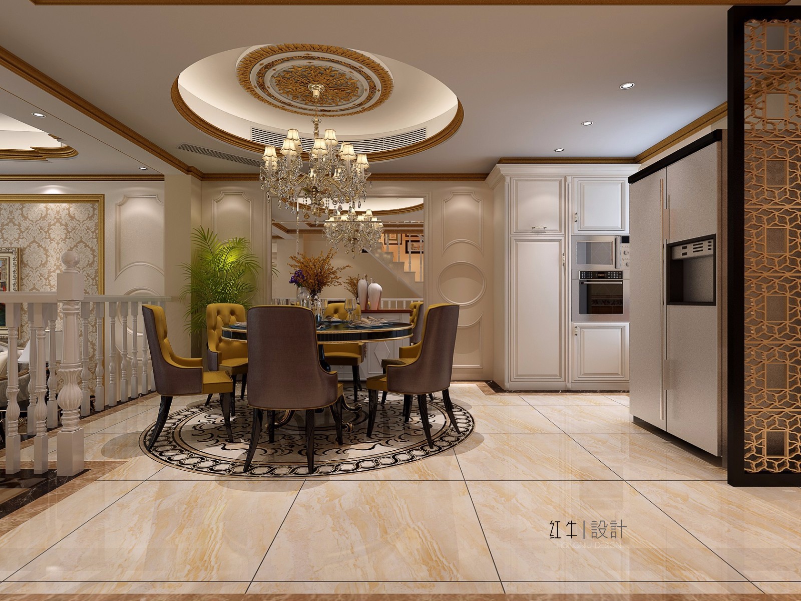 鏡子的反射能夠擴大客廳視野,有了鏡子,客廳仿佛大了一倍。圓形的吊頂與華貴的吊燈相結(jié)合,大氣又時尚。因為廚房空間比例相對較小,所以冰箱被放在了餐廳區(qū)域。