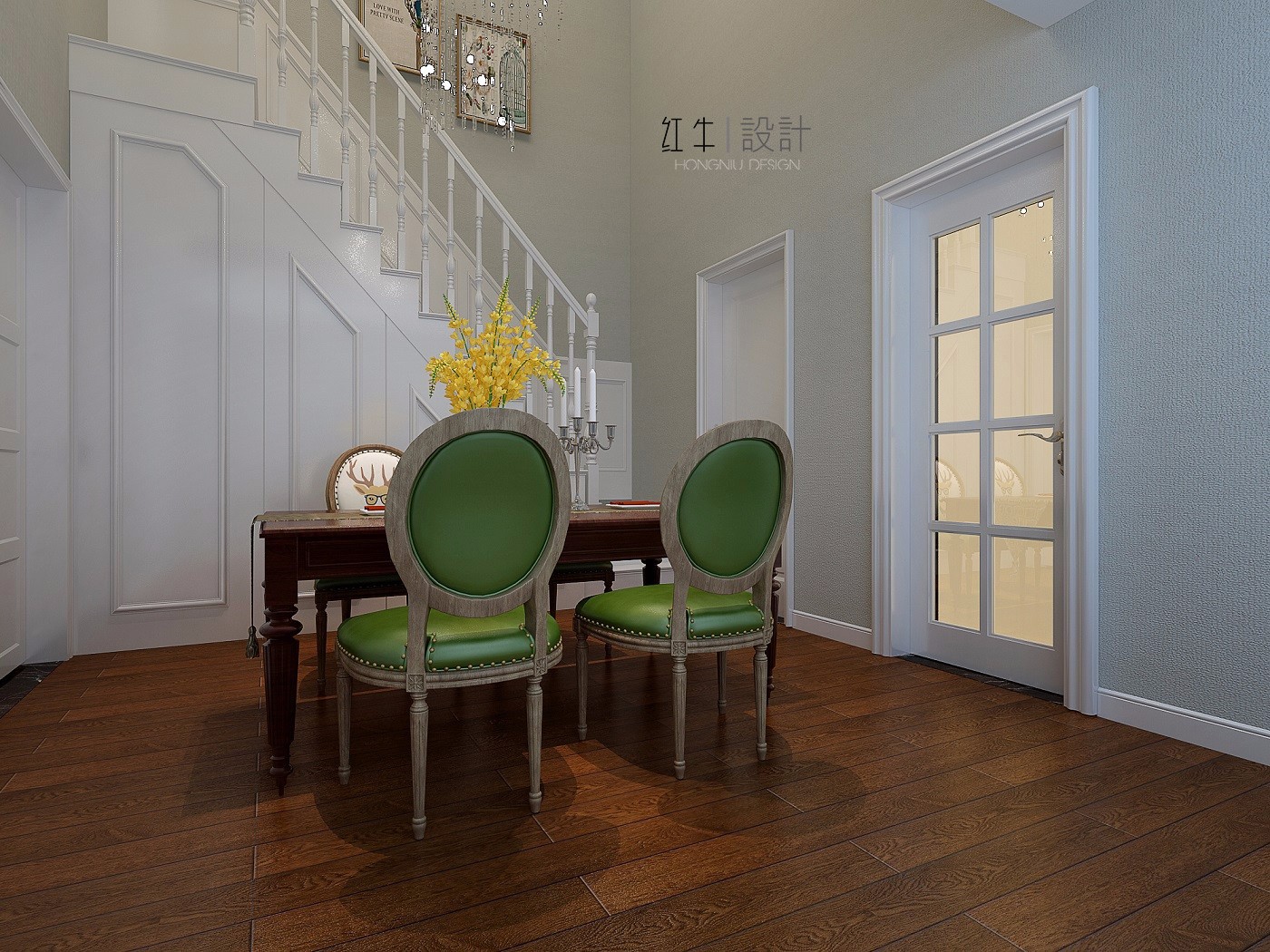 深色地板搭配淺色墻壁,綠色椅子在其中很是亮眼,而當(dāng)綠色遇上鮮嫩的黃色裝飾花時,一種清爽、生動的感覺便油然而生。
