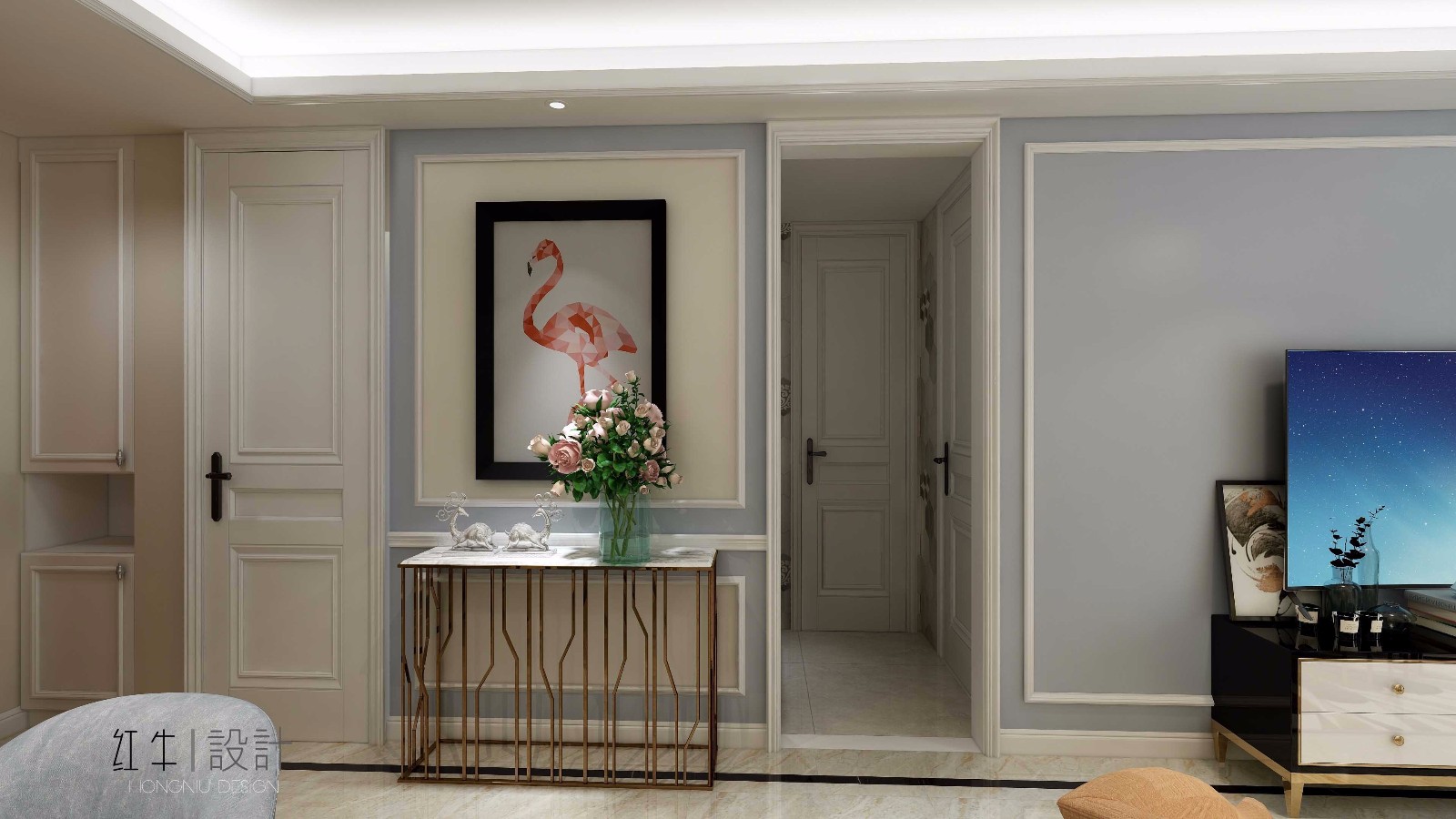 本案是一位年輕的新婚夫婦,客戶品質(zhì)比較高,想要融入一些簡(jiǎn)約美式的元素。三房?jī)蓮d,在平面布局上,客餐廳采光通風(fēng)效果極佳,但是餐廳空間浪費(fèi)太大,廚房開(kāi)間距離太小不方便放下冰箱。經(jīng)過(guò)改造,在餐廳利用石膏板隔墻做出一個(gè)衣帽間,增加了空間的儲(chǔ)物能力,在廚房空間的處理上,利用盥洗區(qū)的隔墻后移“偷”出了12公分的距離可以放下雙開(kāi)門(mén)的冰箱,解決開(kāi)間問(wèn)題,在色彩方面,采用的都是灰藍(lán)系和米色系的顏色。用石膏線條和彩色藝術(shù)漆的結(jié)合,來(lái)襯托整個(gè)客廳空間溫馨柔和的氛圍。在利用亮色裝飾物做點(diǎn)綴,使得空間更有活力。