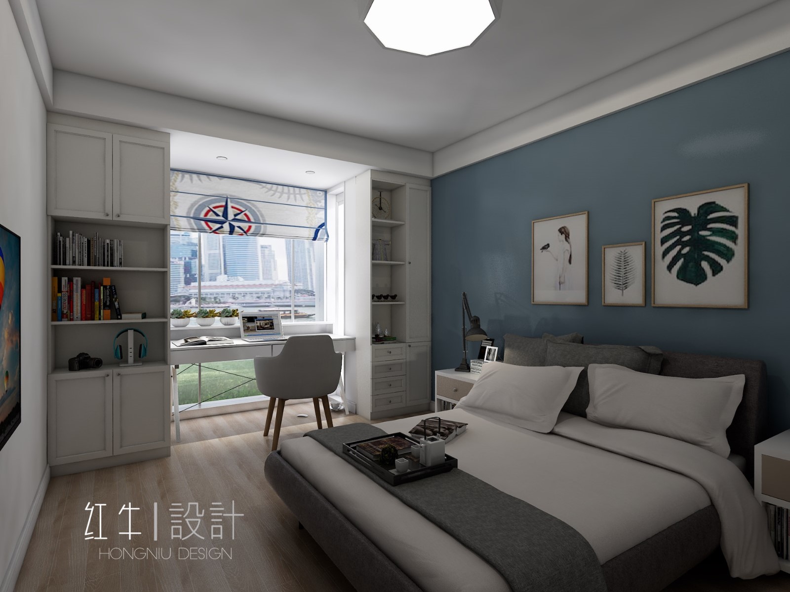 中間擺了一張書桌,位于窗邊光線應該很不錯。窗簾是卷簾的形式,圖案活潑有趣,體現(xiàn)年輕人的新穎與個性。