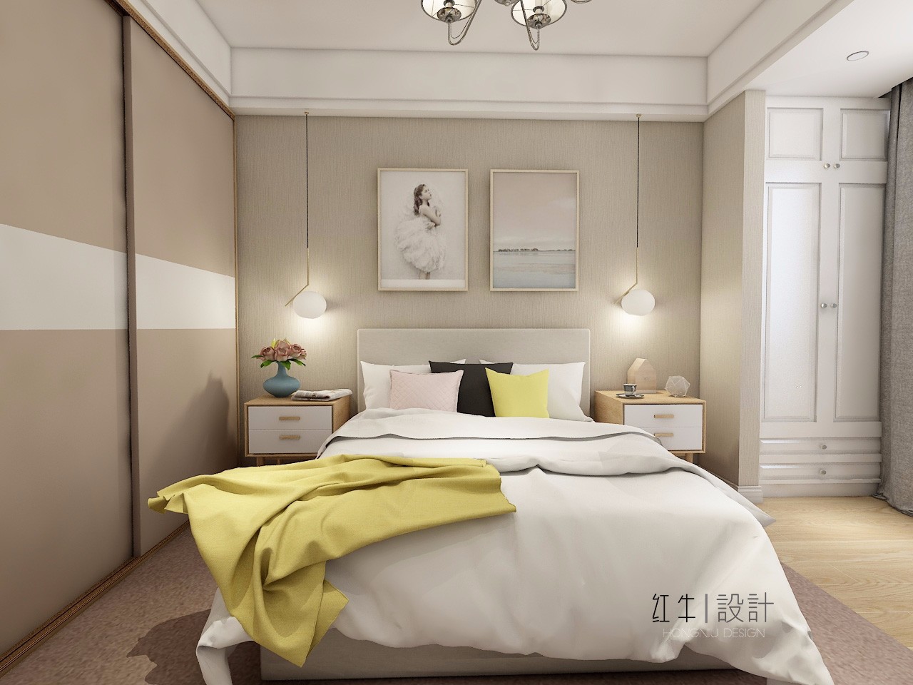 背景墻上對稱懸掛的裝飾畫,透露出一種安寧恬靜的感覺。床頭吊燈不僅能解放出床頭柜面上的空間,還提升了臥室格調(diào)。