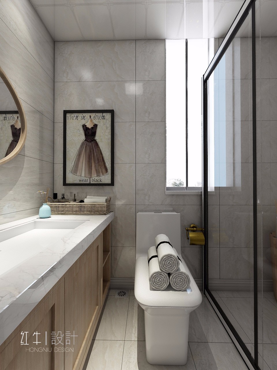 衛(wèi)生間進(jìn)行了干濕分離,干區(qū)部分很有質(zhì)感,無論是瓷磚、墻上的裝飾畫、木質(zhì)浴室柜、大理石臺面、浴室鏡,都顯現(xiàn)出高品質(zhì)。