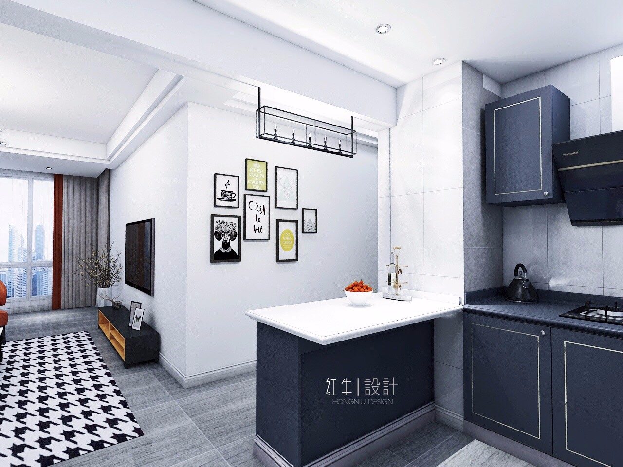 吧臺的一端與墻壁相連接,非常清晰的劃分出廚房的邊界。吧臺可以打造成一個小的餐桌,在這里喝一杯咖啡或者吃個簡餐都很不錯。