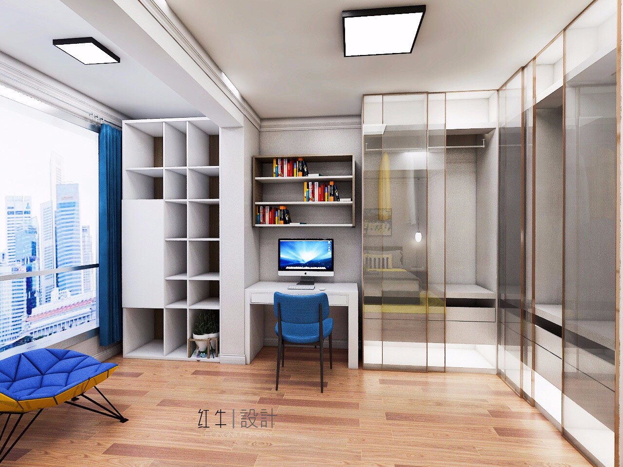 然后就是衣柜部分,柜門是有色玻璃,玻璃質(zhì)感通透,給人一種精致的感覺,效果很是驚艷。還留了一小塊地方放了張書桌,平時可以在此辦公。