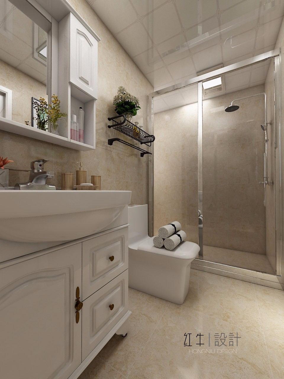 衛(wèi)生間里面不但有洗手臺、底柜,還安裝了鏡柜,開放式柜子與封閉式柜子組合在一起的設(shè)計,讓物品收納有針對性、更細(xì)致?;瘖y鏡下方的置物板平時可以放置常用物品,方便又貼心。