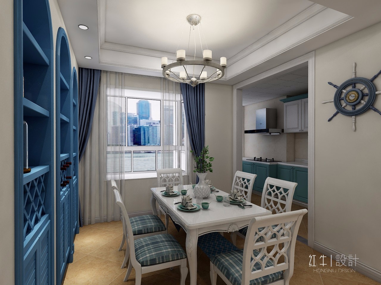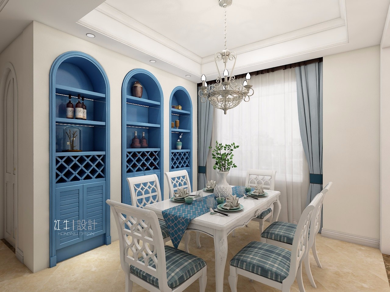 以白色為主色調(diào)的餐廳,顯得尤為純凈雅致,最吸睛的就是藍色的內(nèi)嵌的置物架,頂部的拱形設(shè)計就是地中海風(fēng)格的典型特征。