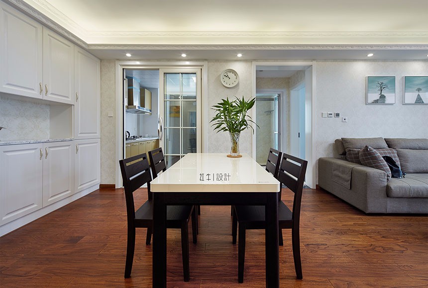 從全面考慮,客廳明亮但不刺眼的光線,使整個空間柔和,干凈,像塊安靜美麗的湖泊。餐廳木頭樸素溫潤的質地總是讓人感覺到微暖,身邊有了木頭,就有了身在大自然的親切舒適感。