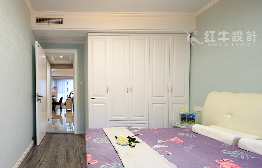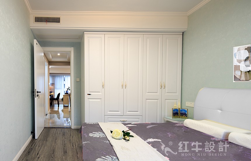 淡青色的墻壁,搭配白色的柜子給人一種清新舒適的視覺(jué)感。床的外觀(guān)簡(jiǎn)單大方,邊邊角角沒(méi)有鋒利的棱角,使得臥室顯得溫暖而又柔軟。