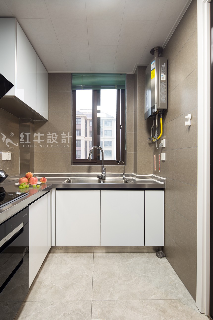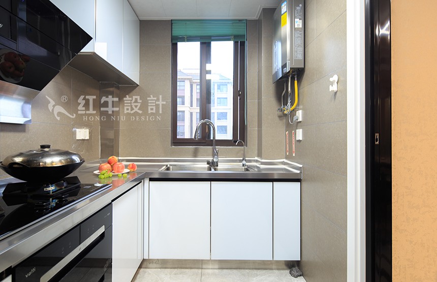 黑色和白色帶來(lái)醒目的對(duì)比,搭配灰色墻面展現(xiàn)出現(xiàn)代感。吊柜擁有強(qiáng)勁的收納功能,油煙機(jī)嵌在吊柜里面,顯得整潔美觀(guān)。廚房安裝了雙水槽,可以分類(lèi)清洗,使用起來(lái)很方便。