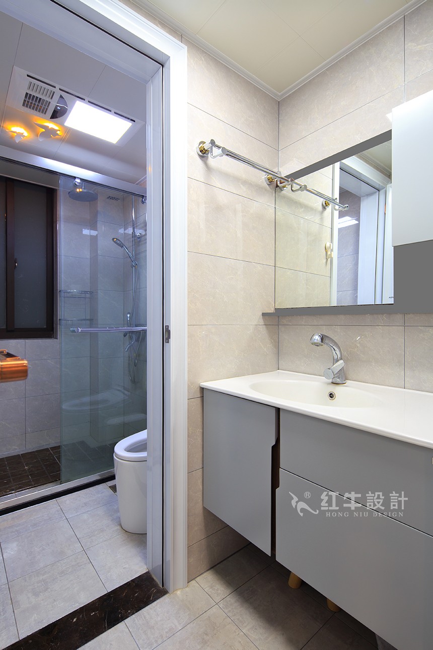 洗手臺(tái)被分離在外,提高了衛(wèi)生間的使用效率。柜子能夠收納零散物品,使之外表清爽整潔。玻璃推拉門(mén)隔斷淋浴區(qū),做到干濕分離,保持沐浴之外的場(chǎng)地干燥衛(wèi)生。