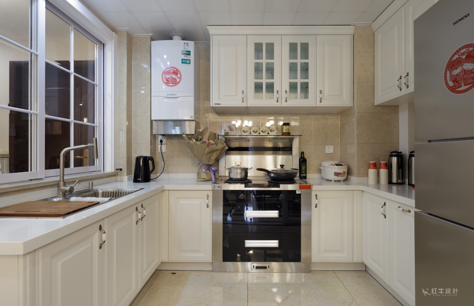廚房和餐廳之間隔了一道推拉門,避免油煙外泄。純白的廚房空間看起來清爽整潔,U型設(shè)計(jì)非常實(shí)用。