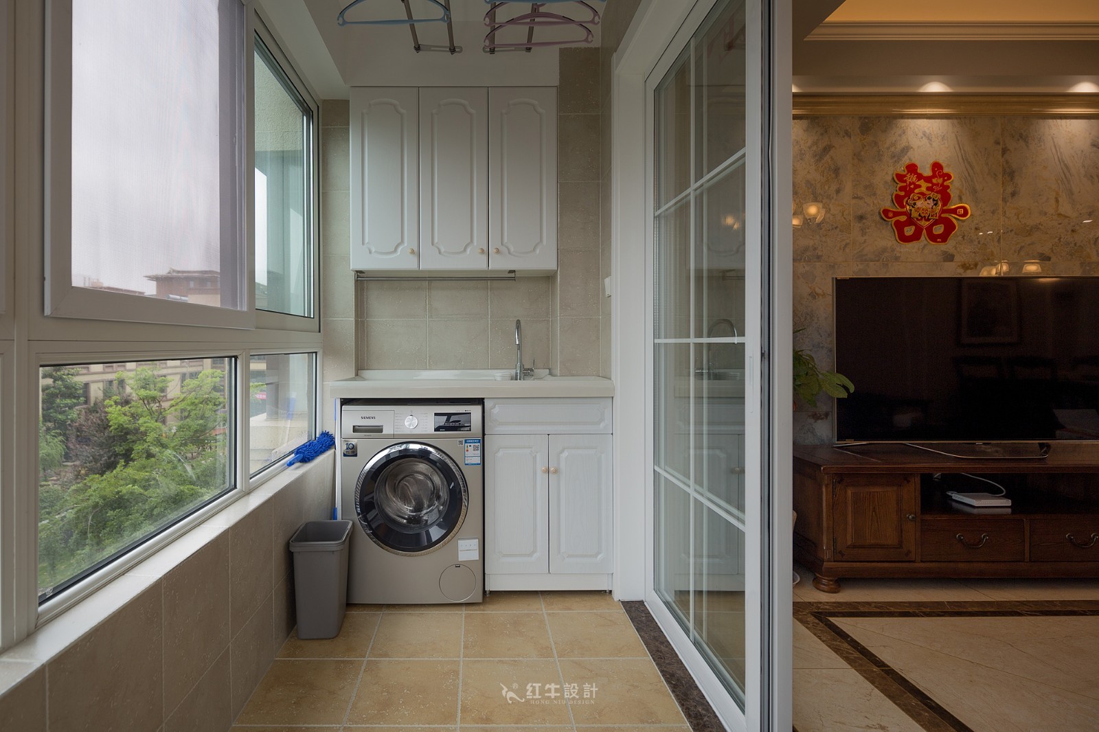 定制的陽臺(tái)柜,將陽臺(tái)空間利用最大化,底部放洗衣機(jī),上方做吊柜,增加了很多收納空間。裝上龍頭水槽更加方便使用,偶爾還可以在陽臺(tái)上清洗東西。