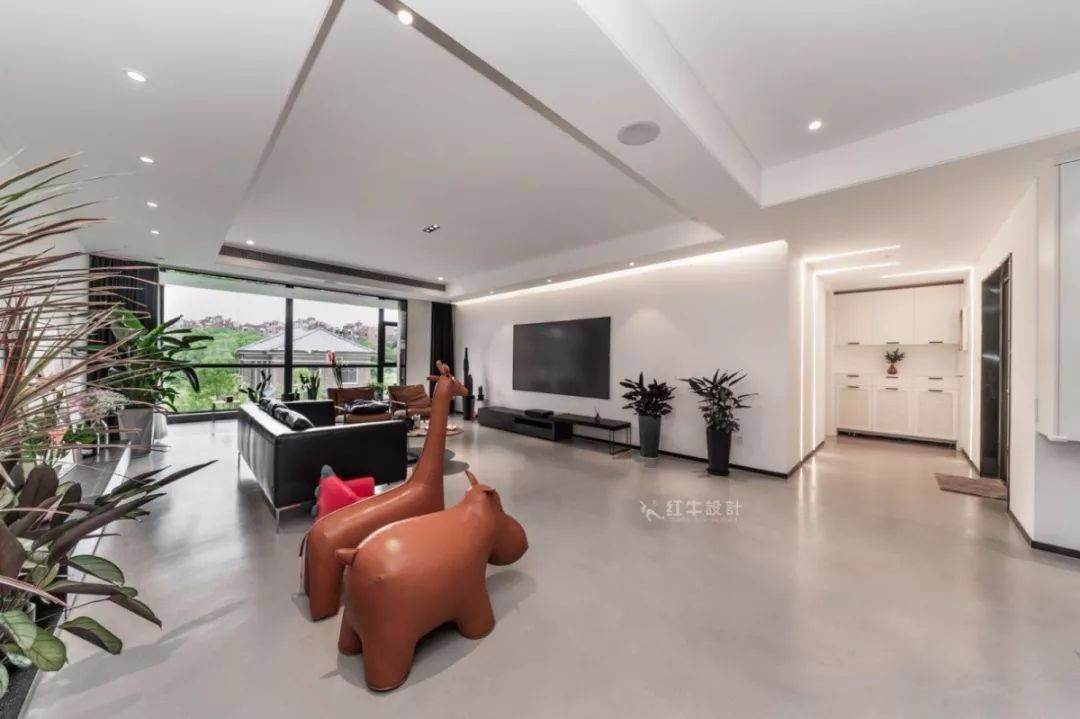 后現(xiàn)代設(shè)計(jì)中會運(yùn)用夸張的色彩和造型,甚至是卡通形象,以喚起我們關(guān)于童年的美好記憶,客廳中的兩個(gè)動物形象就起到了這樣的作用。