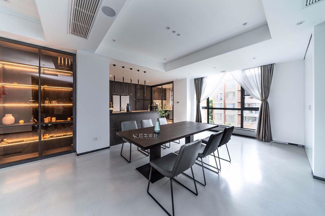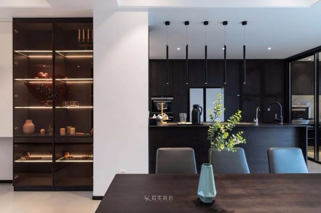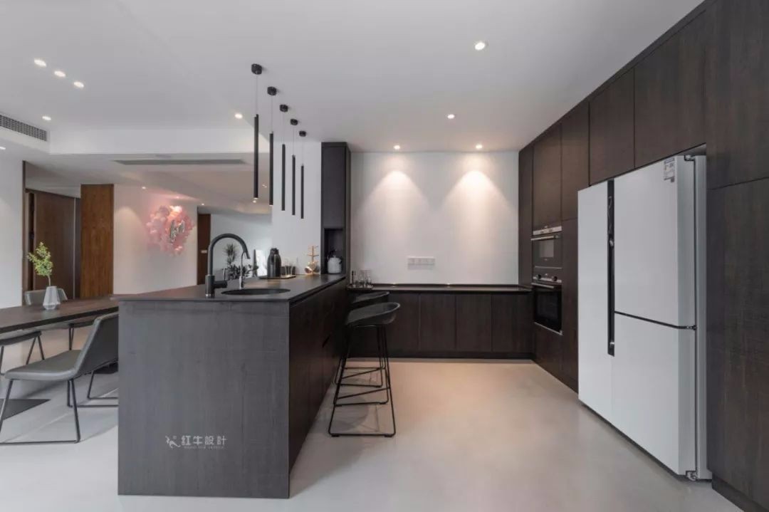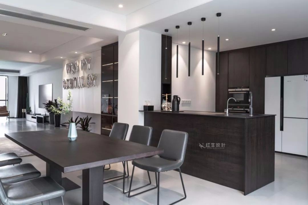 客餐廳位于同一空間,整體采用無主燈設(shè)計(jì),平面吊頂內(nèi)嵌筒燈提供主照明,廚房吧臺上方的長筒吊燈造型獨(dú)特。