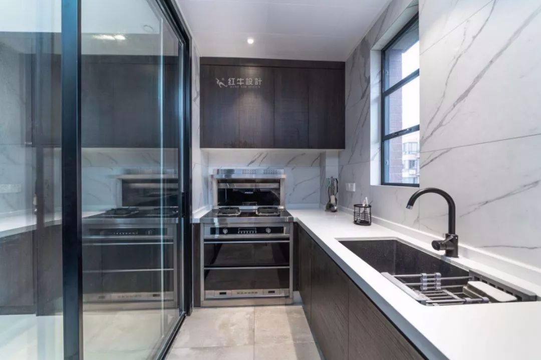 此外,還專門設(shè)計(jì)了中廚空間,如果制作油煙較大的中式菜肴,可以關(guān)上玻璃推拉門,在里面進(jìn)行制作。