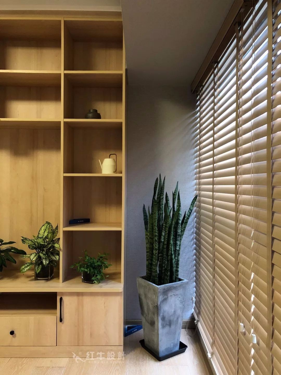 木色的百葉窗,與整體風(fēng)格十分協(xié)調(diào),陽光透過百葉窗照進來,多么富有詩意。