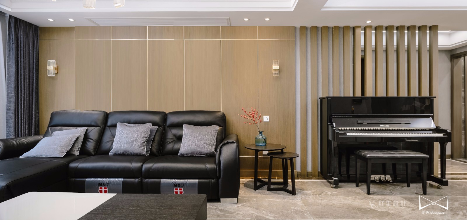極簡(jiǎn)面板使用金屬條進(jìn)行裝飾,搭配沉穩(wěn)大氣的黑色沙發(fā),突出輕奢之感。