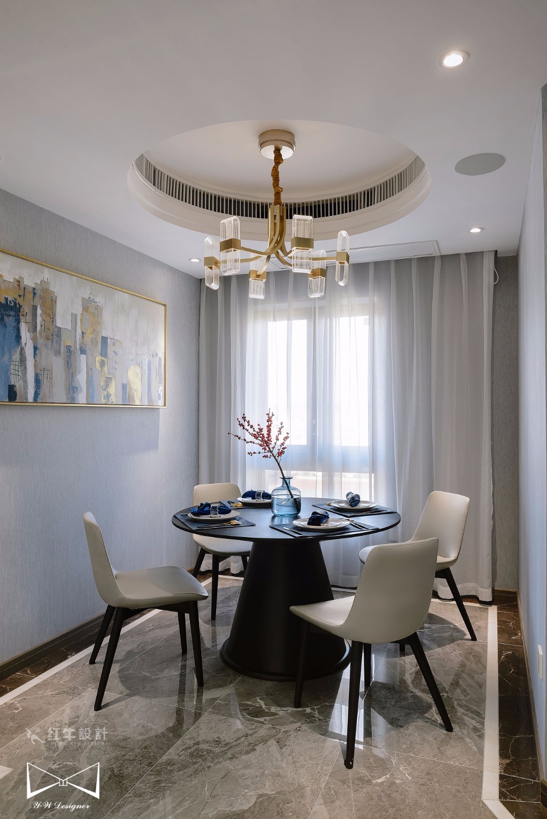 圓形吊頂和圓桌上下呼應(yīng),打造餐廳區(qū)的視覺(jué)焦點(diǎn)。
