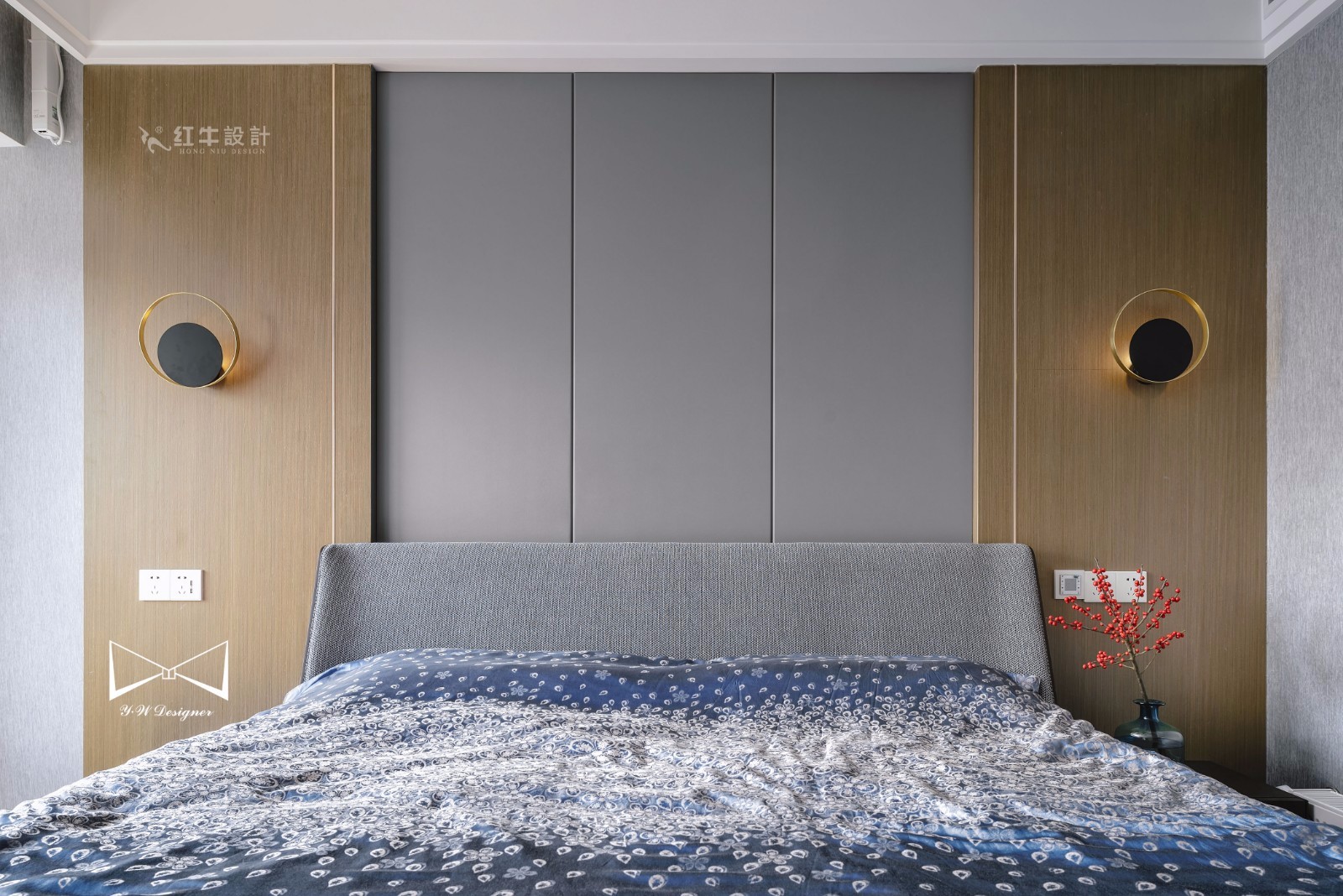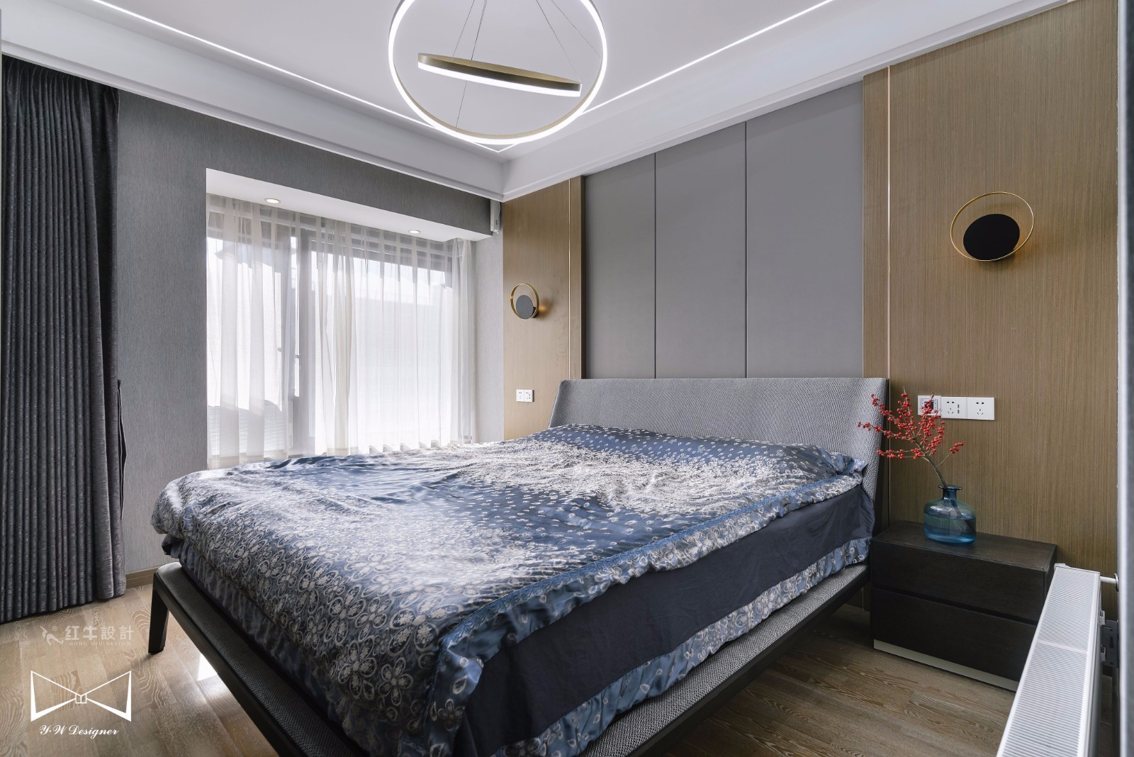 臥室整體運(yùn)用了灰色的墻布搭配木飾面,兩種材質(zhì)的碰撞,營(yíng)造出低調(diào)奢華的臥室氛圍。