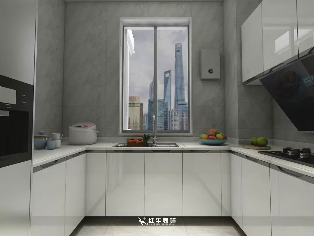 接近正方形的廚房空間里,設(shè)計了U型櫥柜,有充足的活動空間,而且操作非常方便。此外,白色能帶來一種清潔純凈的感覺,非常適合廚房。