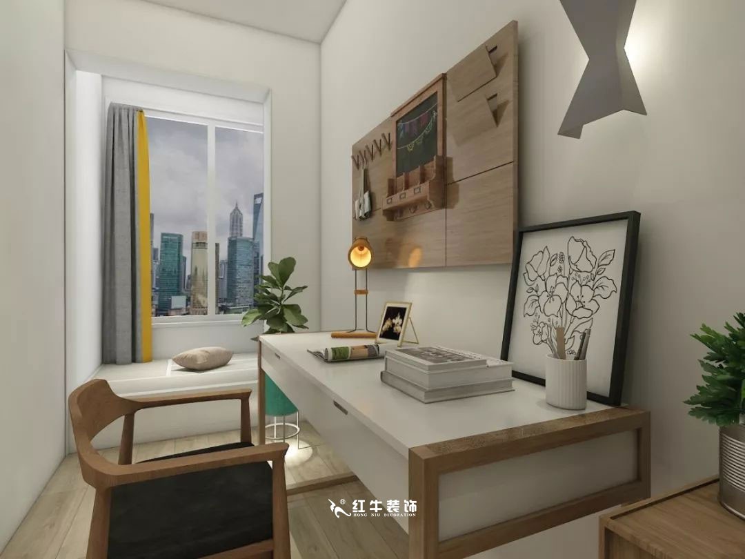 墻角的位置放置了書桌,設(shè)計了壁掛燈,不占空間,而且美觀實用。