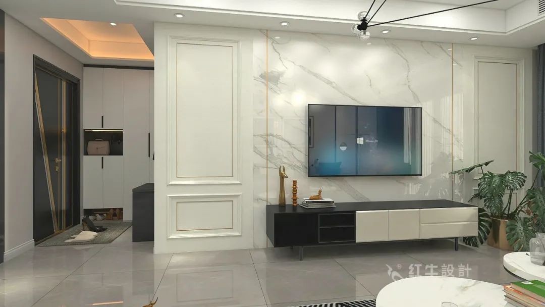 對稱設(shè)計的高級護(hù)墻板加上金屬線條的點綴,中間爵士白大理石板材的鋪貼,讓整個背景層次分明。黑色亮光的電視柜,色彩對比強烈,彰顯極致的魅力。
