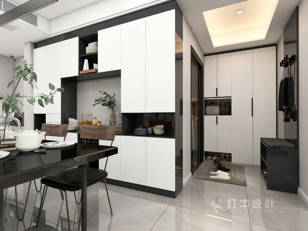 為了避開次臥門和入戶門正對著的風(fēng)水問題,我們把儲藏室打開,只留一個進(jìn)門的鞋柜功能,把次臥室的門開在進(jìn)門的玄關(guān)區(qū)。
