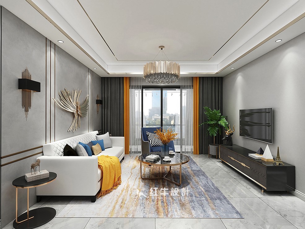 本案是為一家三口設計,的風格定義為現(xiàn)代輕奢,體現(xiàn)了低調(diào)奢華和簡約時尚的相互融合,滿足了客戶對裝修簡單但精致的需求,營造出一種空間氛圍,體現(xiàn)客戶的生活品味。設計風格定位時,避免了現(xiàn)代過分簡約的居家風格,而是從現(xiàn)代風格中提取了簡約之美,使用金屬與黑白灰進行表達,選擇灰色的地磚,背景墻和墻面涂料,讓空間顯得融為一體且舒適,但深色的空間表達并不會感覺壓抑,因為在陳設上融入了輕奢的元素,使用金屬配飾和金屬線條與灰色的空間相互呼應,為空間營造出時尚摩登的韻味,演繹出現(xiàn)代精英人群的生活品質(zhì),即使經(jīng)歷出漫長的時光依舊耐看。在家具的選擇上選擇了跳躍性的顏色,如土橘色和深藍色,這些跳躍的色彩與灰度的空間形成深淺的對比,讓空間充滿了設計感,并且富有層次感,舒適、黑白分明的創(chuàng)建了清晰的視覺框架,營造出非凡的生活品味。