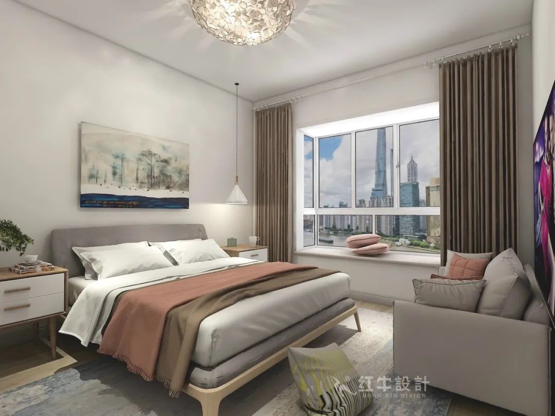 北面房間面積較小,采光通風(fēng)也不理想,還與客衛(wèi)相通,顯然不可取,為了使其具備臥室的空間面積,可以把北陽臺(tái)并入,整體設(shè)計(jì)成一間能夠滿足業(yè)主需求的、功能齊全的臥室來。