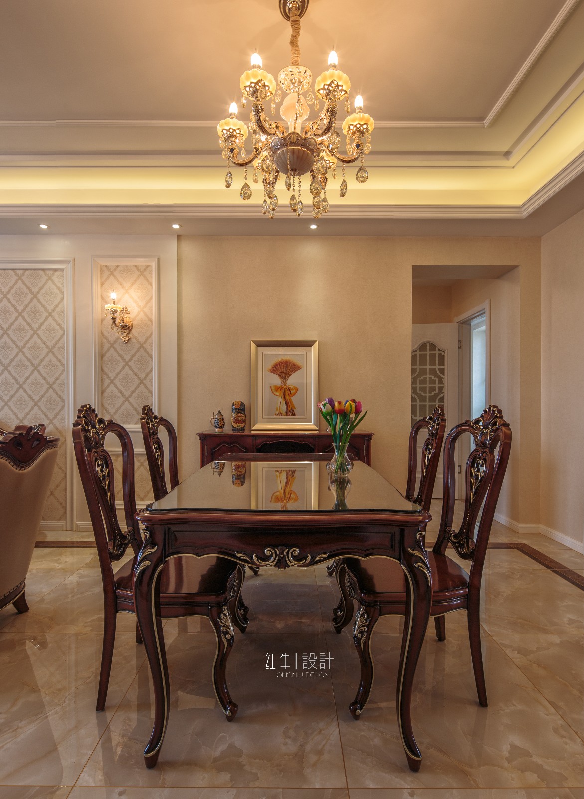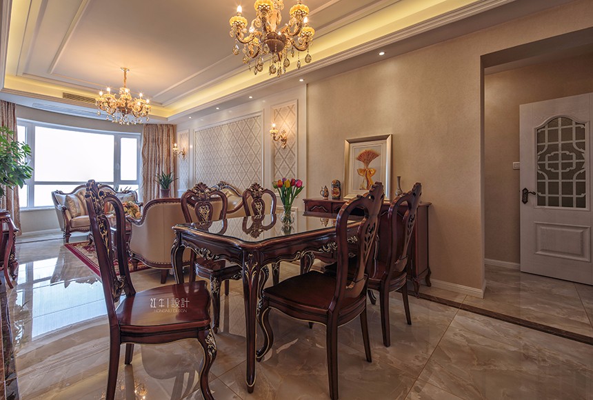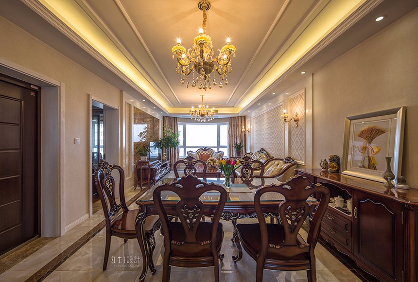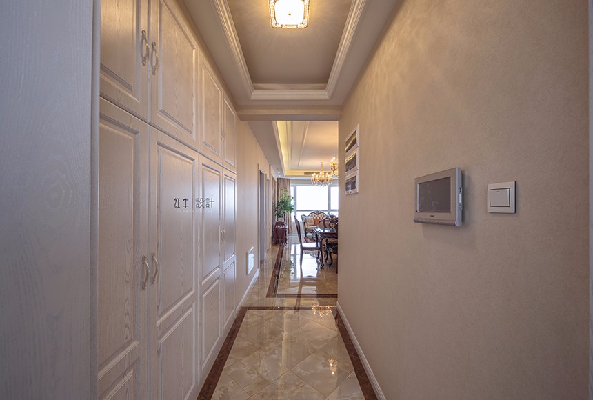 分享和交流是本案的精髓。初次溝通,此案是祖孫三代同住,業(yè)主為中年人,經(jīng)常去歐洲國(guó)家出差,對(duì)歐洲文化獨(dú)有情鐘,所以此案有效的利用空間、并用簡(jiǎn)約明快的造型及色彩以突顯空間及功能的延續(xù)性,并融合歐式的裝飾元素及裝飾色彩。設(shè)計(jì)中的造型呼應(yīng)的技巧,頂面造型和地面材質(zhì)造型的相互呼應(yīng),沙發(fā)背景和電視背景造型的相互呼應(yīng),門廳造景和餐廳造景的相互呼應(yīng),運(yùn)用多組呼應(yīng)的設(shè)計(jì)技巧,像作文章的排比句,把整個(gè)空間貫穿起來(lái),使得氛圍更加濃烈,整體性更加統(tǒng)一。打造出一個(gè)共享、時(shí)尚、典雅的居住空間。