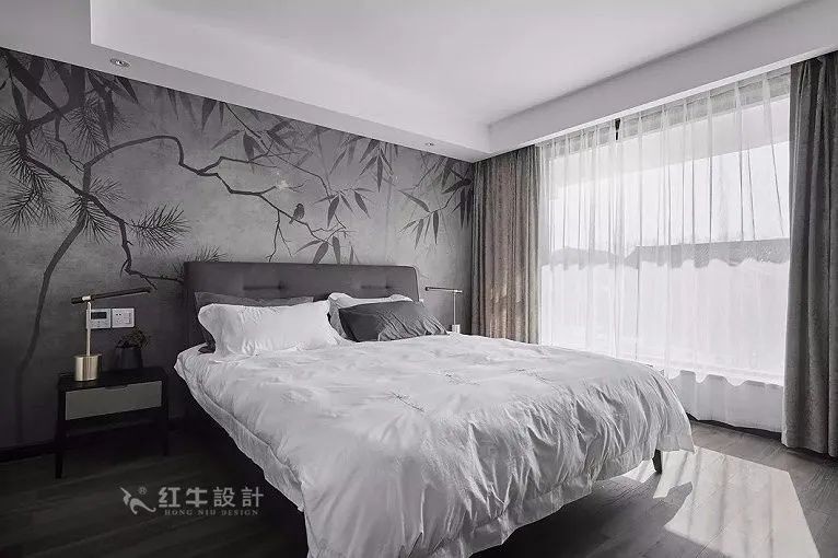 家具造型以簡潔的線條為主,背景墻是極具東方韻味的竹葉墻布,嚴整的格局和平和的調(diào)性渾然一體,契合中國傳統(tǒng)文藝崇尚的中和雅正之美。