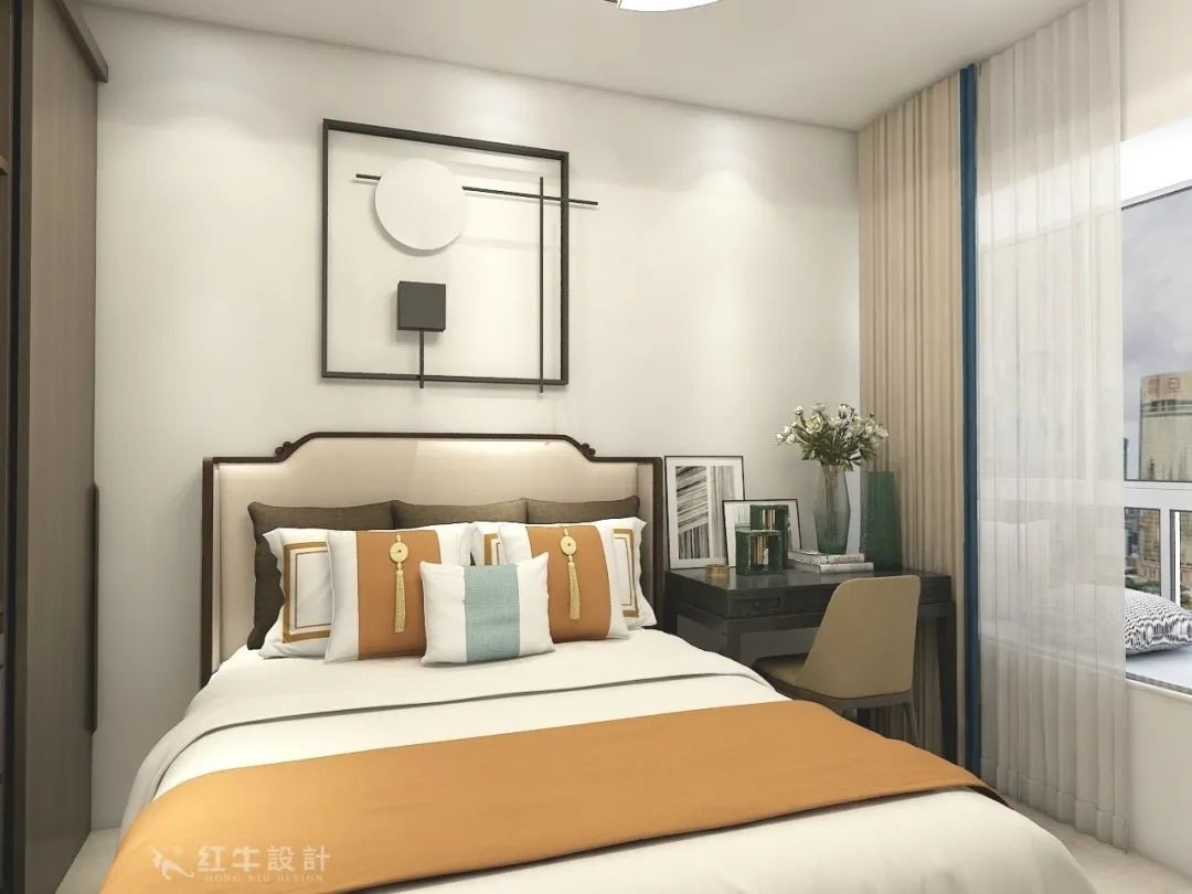 臥室主要以寧?kù)o、偏暖的色調(diào)為主,柔和的燈光給人以溫馨、朦朧的視覺(jué)美感,床品上的色彩和圖案讓人感受到濃濃的人情味。