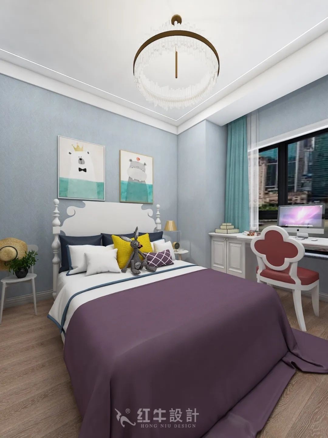 藍(lán)色的墻面營(yíng)造出寧?kù)o的氛圍。床品、裝飾畫(huà)的選擇顯得活潑有童趣。窗邊的書(shū)桌椅,為孩子提供非常充足的學(xué)習(xí)空間。