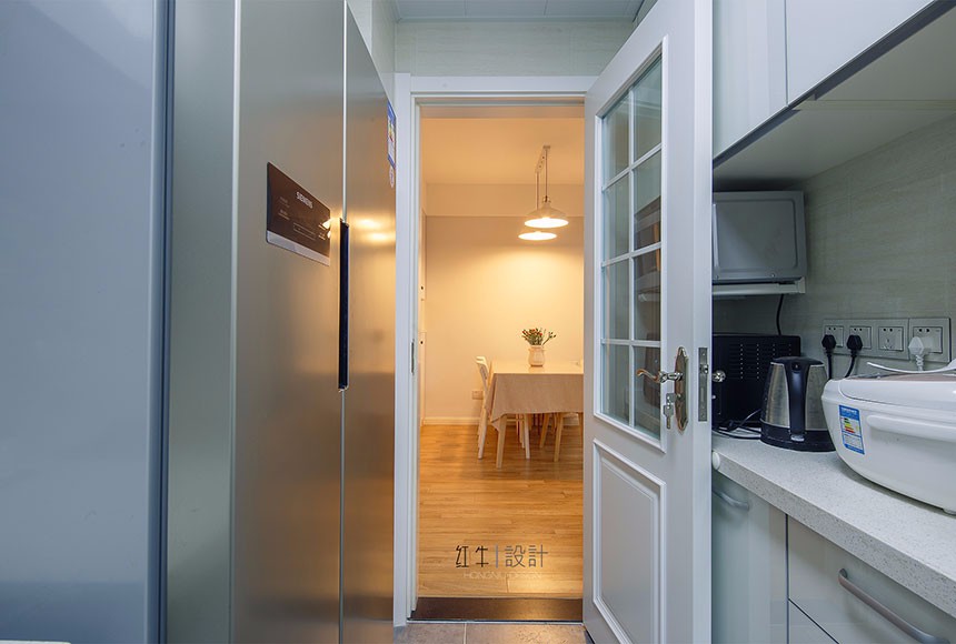 2.由于廚房的開(kāi)間比較小,只夠做一個(gè)L型的柜子,再加上要放雙門(mén)冰箱,廚柜操作臺(tái)面特別小,所以把衛(wèi)生間和廚房的中間墻體拆掉,縮小的衛(wèi)生間的開(kāi)間,擴(kuò)大了廚房的空間,增出了很多臺(tái)面。